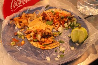 タコス(パストール、チョリソ)Taqueria Original Corona/メキシコハリスコ州グアダラハラ、カテドラル裏のメルカド内18ペソ=136円 2010.11.29 |
